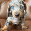 Description: Meet Coco, a stunning smooth-coated miniature dachshund in the rare and beauty. She has a soft, silvery-lilac body with warm tan points on her eyebrows, cheeks, chest, legs, and paws that make her look like a little piece of luxury. Her sleek coat shines in the sunlight, and her big, bright eyes (one blue, one amber) give her the sweetest, most soulful expression.