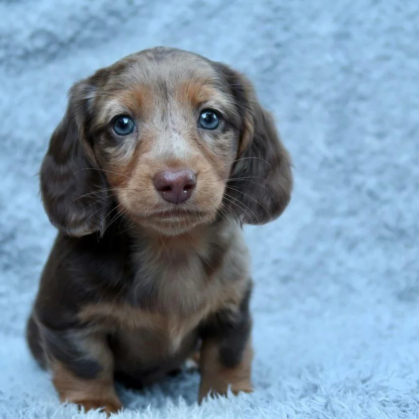 Description: Meet Rosie, the sweetest little long-haired miniature dachshund you’ll ever see! She has a beautiful chocolate-and-tan dapple coat with soft waves of rich brown, warm cream, and delicate silver-gray markings that give her a truly unique and gorgeous look. Her long, silky hair is already feathering around her ears, chest, and tail, and it feels as soft as can be. Rosie’s big, bright blue eyes and gentle expression make her absolutely irresistible — one look and you’ll be hooked!